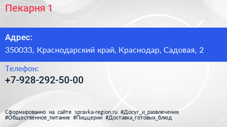 Пекарня №1 по адресу 350033, Краснодарский край, Краснодар, Садовая, 2 в дальнейшем Организация, размещена в следующих категориях: