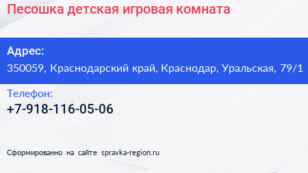 Песошка, детская игровая комната по адресу 350059, Краснодарский край, Краснодар, Уральская, 79/1 в дальнейшем Организация, размещена в следующих категориях: