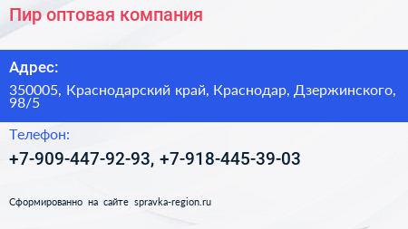 Пир, оптовая компания по адресу 350005, Краснодарский край, Краснодар, Дзержинского, 98/5 в дальнейшем Организация, размещена в следующих категориях: