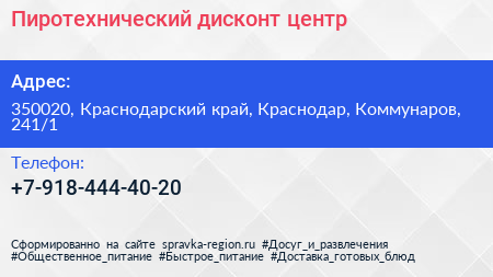 Пиротехнический дисконт-центр по адресу 350020, Краснодарский край, Краснодар, Коммунаров, 241/1 в дальнейшем Организация, размещена в следующих категориях: