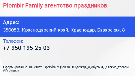 Plombir Family, агентство праздников по адресу 350053, Краснодарский край, Краснодар, Баварская, 8 в дальнейшем Организация, размещена в следующих категориях: