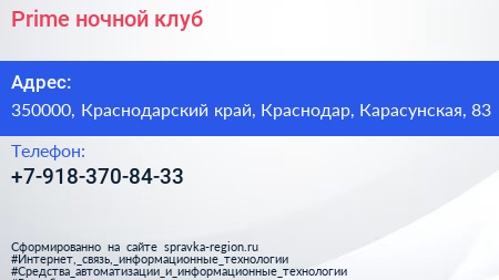 Prime, ночной клуб по адресу 350000, Краснодарский край, Краснодар, Карасунская, 83 в дальнейшем Организация, размещена в следующих категориях:
