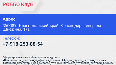 РОББО Клуб по адресу 350089, Краснодарский край, Краснодар, Генерала Шифрина, 1/1 в дальнейшем Организация, размещена в следующих категориях: