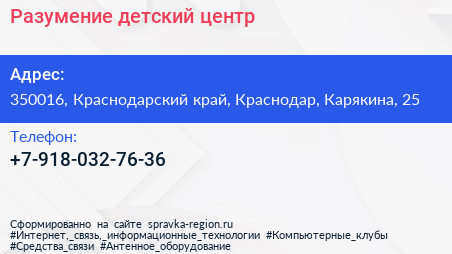 Разумение, детский центр по адресу 350016, Краснодарский край, Краснодар, Карякина, 25 в дальнейшем Организация, размещена в следующих категориях: