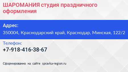 ШАРОМАНИЯ, студия праздничного оформления по адресу 350004, Краснодарский край, Краснодар, Минская, 122/2 в дальнейшем Организация, размещена в следующих категориях: