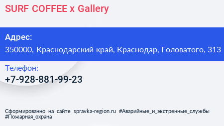 SURF COFFEE x Gallery по адресу 350000, Краснодарский край, Краснодар, Головатого, 313 в дальнейшем Организация, размещена в следующих категориях: