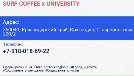 SURF COFFEE x UNIVERSITY по адресу 350040, Краснодарский край, Краснодар, Ставропольская, 220/2 в дальнейшем Организация, размещена в следующих категориях: