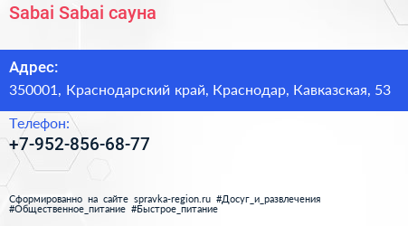 Sabai-Sabai, сауна по адресу 350001, Краснодарский край, Краснодар, Кавказская, 53 в дальнейшем Организация, размещена в следующих категориях: