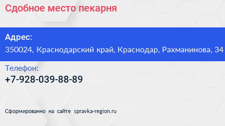 Сдобное место, пекарня по адресу 350024, Краснодарский край, Краснодар, Рахманинова, 34 в дальнейшем Организация, размещена в следующих категориях: