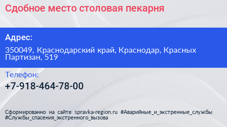 Сдобное место, столовая-пекарня по адресу 350049, Краснодарский край, Краснодар, Красных Партизан, 519 в дальнейшем Организация, размещена в следующих категориях: