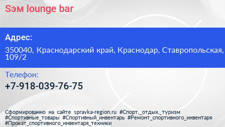 Sэм lounge bar по адресу 350040, Краснодарский край, Краснодар, Ставропольская, 109/2 в дальнейшем Организация, размещена в следующих категориях:
