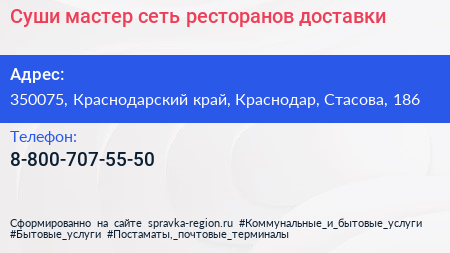 Суши мастер, сеть ресторанов доставки по адресу 350075, Краснодарский край, Краснодар, Стасова, 186 в дальнейшем Организация, размещена в следующих категориях: