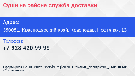 Суши на районе, служба доставки по адресу 350051, Краснодарский край, Краснодар, Нефтяная, 13 в дальнейшем Организация, размещена в следующих категориях: