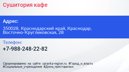 Сушитория, кафе по адресу 350028, Краснодарский край, Краснодар, Восточно-Кругликовская, 28 в дальнейшем Организация, размещена в следующих категориях:
