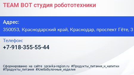 TEAM BOT, студия робототехники по адресу 350053, Краснодарский край, Краснодар, проспект Гёте, 3 в дальнейшем Организация, размещена в следующих категориях:
