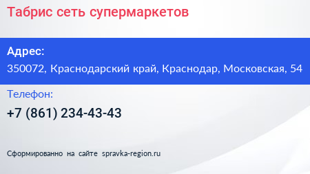 Табрис, сеть супермаркетов по адресу 350072, Краснодарский край, Краснодар, Московская, 54 в дальнейшем Организация, размещена в следующих категориях: