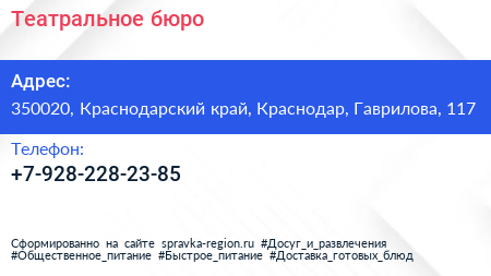Театральное бюро по адресу 350020, Краснодарский край, Краснодар, Гаврилова, 117 в дальнейшем Организация, размещена в следующих категориях: