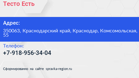 Тесто Есть по адресу 350063, Краснодарский край, Краснодар, Комсомольская, 55 в дальнейшем Организация, размещена в следующих категориях: