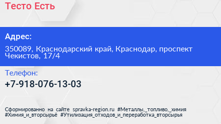 Тесто Есть по адресу 350089, Краснодарский край, Краснодар, проспект Чекистов, 17/4 в дальнейшем Организация, размещена в следующих категориях: