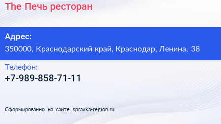 The Печь, ресторан по адресу 350000, Краснодарский край, Краснодар, Ленина, 38 в дальнейшем Организация, размещена в следующих категориях:
