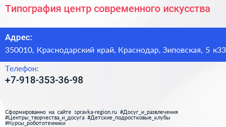 Типография, центр современного искусства по адресу 350010, Краснодарский край, Краснодар, Зиповская, 5 к33 в дальнейшем Организация, размещена в следующих категориях: