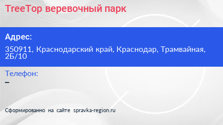 TreeTop, веревочный парк по адресу 350911, Краснодарский край, Краснодар, Трамвайная, 2Б/10 в дальнейшем Организация, размещена в следующих категориях: