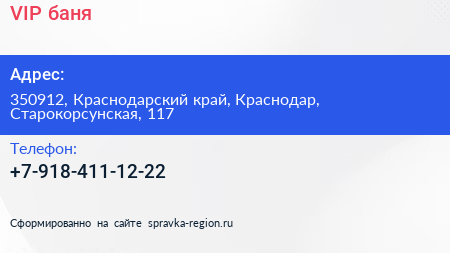 VIP, баня по адресу 350912, Краснодарский край, Краснодар, Старокорсунская, 117 в дальнейшем Организация, размещена в следующих категориях: