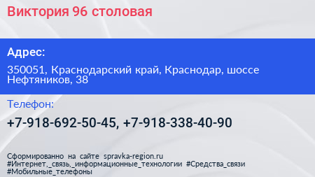 Виктория-96, столовая по адресу 350051, Краснодарский край, Краснодар, шоссе Нефтяников, 38 в дальнейшем Организация, размещена в следующих категориях: