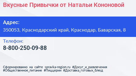 Вкусные Привычки от Натальи Кононовой по адресу 350053, Краснодарский край, Краснодар, Баварская, 8 в дальнейшем Организация, размещена в следующих категориях: