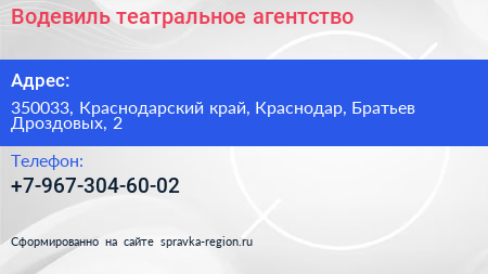 Водевиль, театральное агентство по адресу 350033, Краснодарский край, Краснодар, Братьев Дроздовых, 2 в дальнейшем Организация, размещена в следующих категориях: