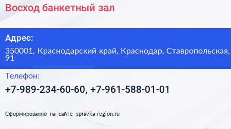 Восход, банкетный зал по адресу 350001, Краснодарский край, Краснодар, Ставропольская, 91 в дальнейшем Организация, размещена в следующих категориях: