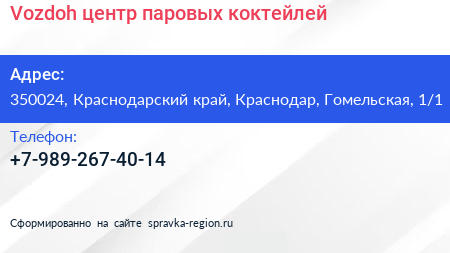 Vozdoh, центр паровых коктейлей по адресу 350024, Краснодарский край, Краснодар, Гомельская, 1/1 в дальнейшем Организация, размещена в следующих категориях: