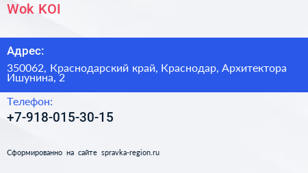 Wok KOI по адресу 350062, Краснодарский край, Краснодар, Архитектора Ишунина, 2 в дальнейшем Организация, размещена в следующих категориях: