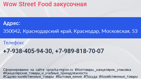 Wow Street Food, закусочная по адресу 350042, Краснодарский край, Краснодар, Московская, 53 в дальнейшем Организация, размещена в следующих категориях: