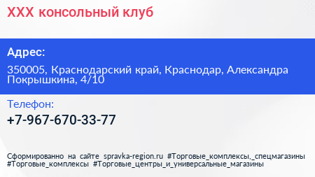 XXX, консольный клуб по адресу 350005, Краснодарский край, Краснодар, Александра Покрышкина, 4/10 в дальнейшем Организация, размещена в следующих категориях: