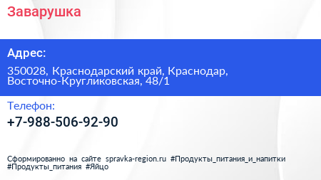 Заварушка по адресу 350028, Краснодарский край, Краснодар, Восточно-Кругликовская, 48/1 в дальнейшем Организация, размещена в следующих категориях: