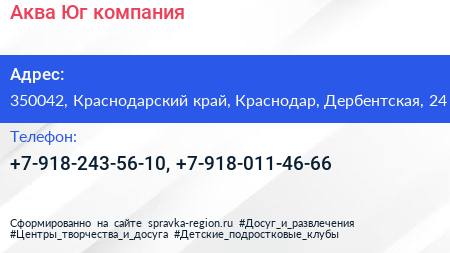 Аква Юг, компания по адресу 350042, Краснодарский край, Краснодар, Дербентская, 24 в дальнейшем Организация, размещена в следующих категориях:
