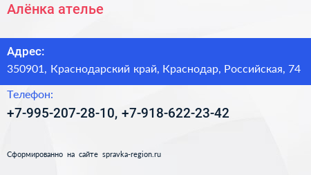 Алёнка, ателье по адресу 350901, Краснодарский край, Краснодар, Российская, 74 в дальнейшем Организация, размещена в следующих категориях: