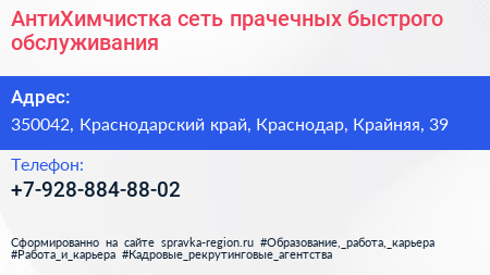АнтиХимчистка, сеть прачечных быстрого обслуживания по адресу 350042, Краснодарский край, Краснодар, Крайняя, 39 в дальнейшем Организация, размещена в следующих категориях: