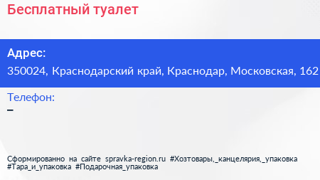 Бесплатный туалет по адресу 350024, Краснодарский край, Краснодар, Московская, 162 в дальнейшем Организация, размещена в следующих категориях: