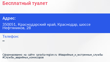 Бесплатный туалет по адресу 350051, Краснодарский край, Краснодар, шоссе Нефтяников, 28 в дальнейшем Организация, размещена в следующих категориях: