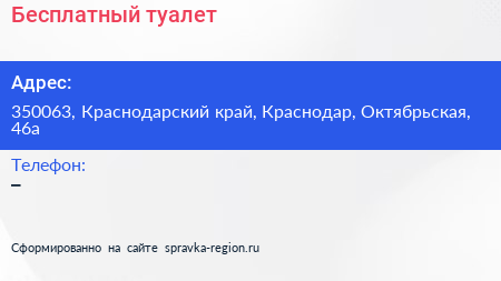 Бесплатный туалет по адресу 350063, Краснодарский край, Краснодар, Октябрьская, 46а в дальнейшем Организация, размещена в следующих категориях: