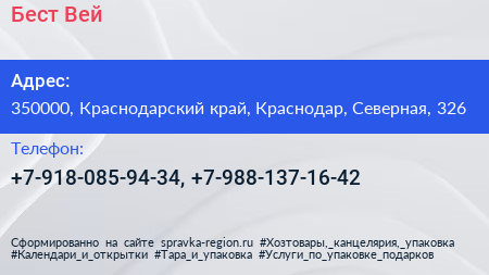 Бест Вей по адресу 350000, Краснодарский край, Краснодар, Северная, 326 в дальнейшем Организация, размещена в следующих категориях: