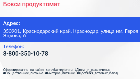 Бокси, продуктомат по адресу 350901, Краснодарский край, Краснодар, улица им. Героя Яцкова, 6 в дальнейшем Организация, размещена в следующих категориях: