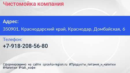 Чистомойка, компания по адресу 350901, Краснодарский край, Краснодар, Домбайская, 6 в дальнейшем Организация, размещена в следующих категориях: