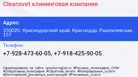 Cleansvet, клининговая компания по адресу 350020, Краснодарский край, Краснодар, Рашпилевская, 157 в дальнейшем Организация, размещена в следующих категориях: