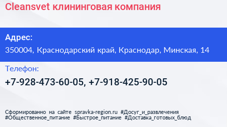 Cleansvet, клининговая компания по адресу 350004, Краснодарский край, Краснодар, Минская, 14 в дальнейшем Организация, размещена в следующих категориях: