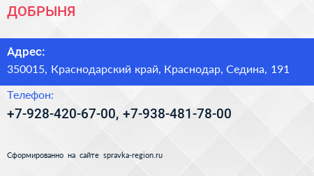 ДОБРЫНЯ по адресу 350015, Краснодарский край, Краснодар, Седина, 191 в дальнейшем Организация, размещена в следующих категориях: