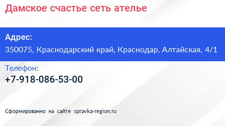 Дамское счастье, сеть ателье по адресу 350075, Краснодарский край, Краснодар, Алтайская, 4/1 в дальнейшем Организация, размещена в следующих категориях: