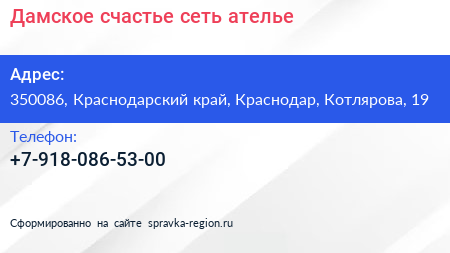 Дамское счастье, сеть ателье по адресу 350086, Краснодарский край, Краснодар, Котлярова, 19 в дальнейшем Организация, размещена в следующих категориях: